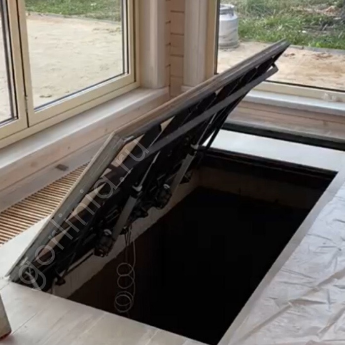 При открывании руками вернуть механизм в исходное положение "закрыто" и только после этого можно пользоваться автоматической системой электроподъемников!Изделие отгружается с установленными подъемниками и соединительными проводами. Актуаторы выставлены соосно и отрегулированы с контрольным пуском инженером по качеству изготовителя. Снизу по стороне шарниров стоит кронштейн на направляющих. Узел выставляется и крепится в торец плиты пола, а также к реактивной планке после установки при поднятой крышке согласно инструкции.
